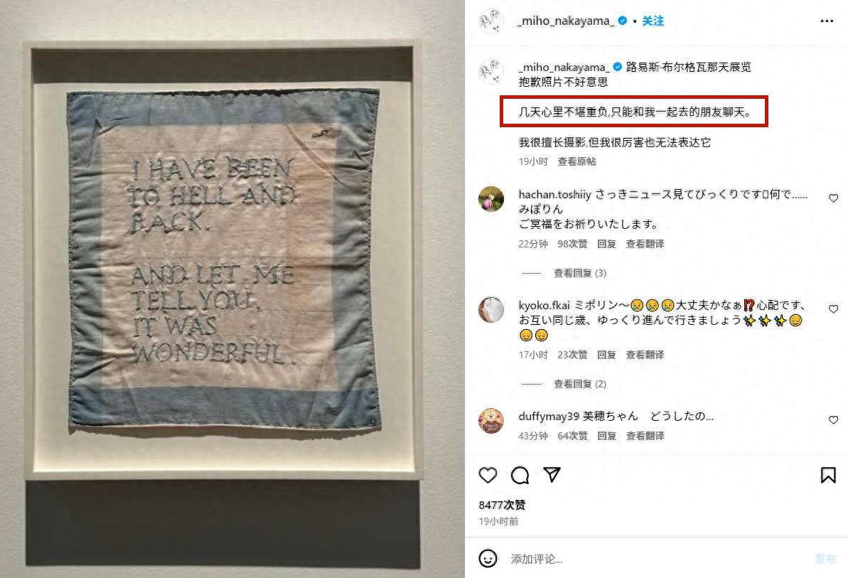 12月5日,也就是去世的前一天,中山美穗在社交賬號上分享了一張看展的照片,她還寫道“我去過了地獄又回來,讓我告訴你那裏真的很不錯”,此外,她還配文“這幾天心裏不堪重負,只能和我一起去的朋友聊天。”