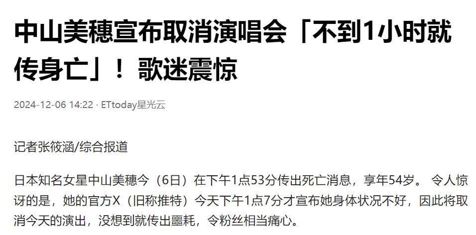 值得一提的是中山美穗是在12月6日下午1時53分傳出離世消息,而在下午1時7分她的官方賬號才宣佈因爲身體狀況不好,取消原本定在6日舉行的聖誕音樂會。