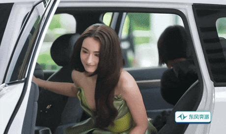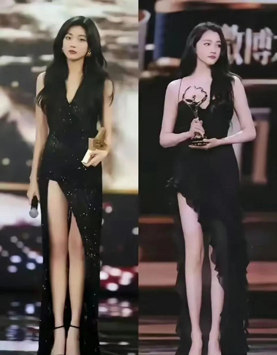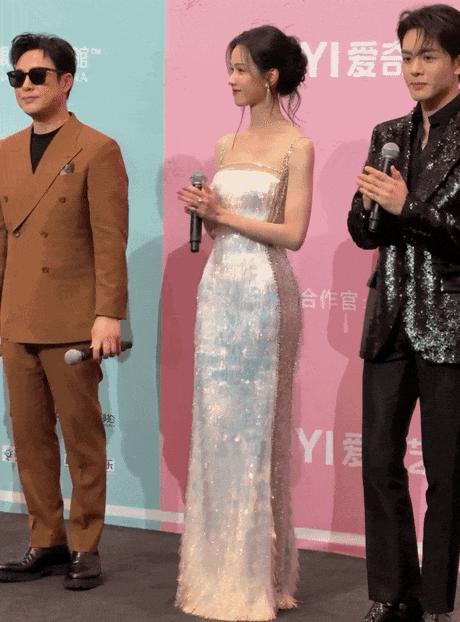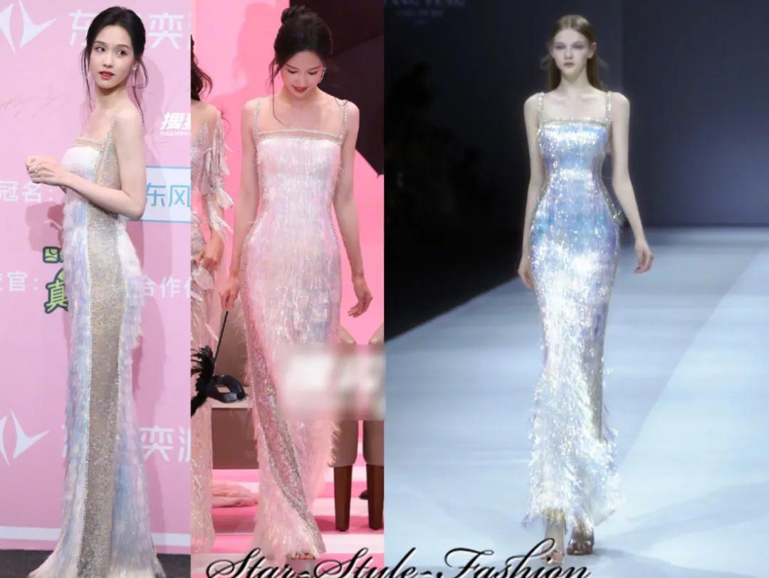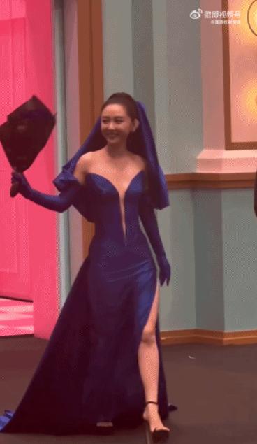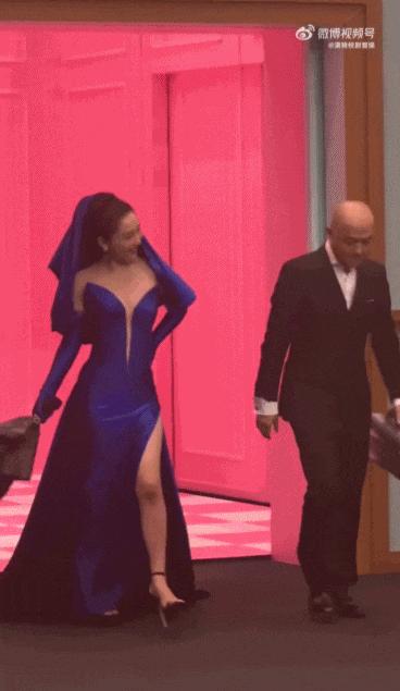 相比之下,吳倩這件露膚度要更高,可以看到側邊開叉到大腿根上了。