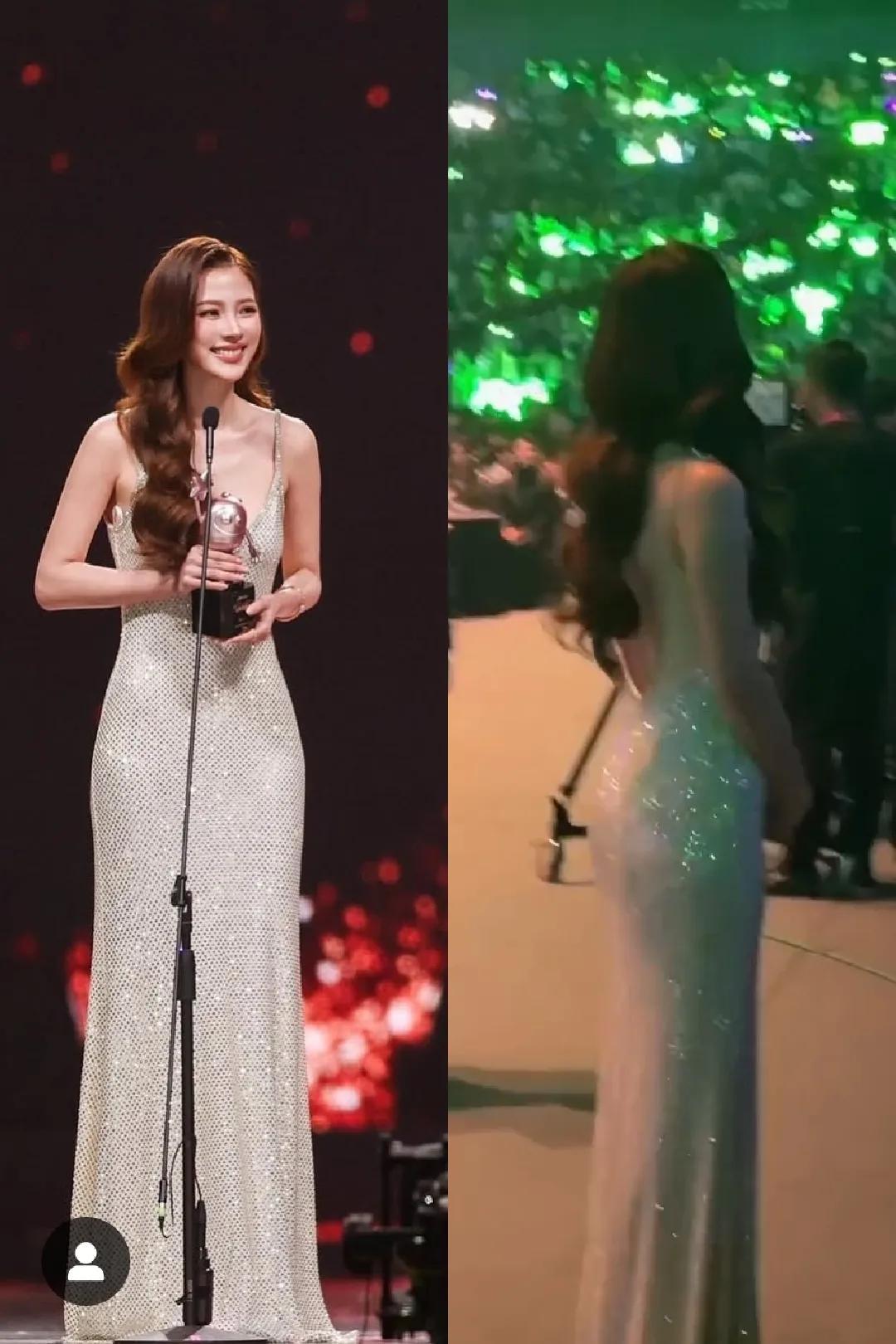 對比之下,內場這件銀色深V禮服更適合她,突出了身材的曲線美。