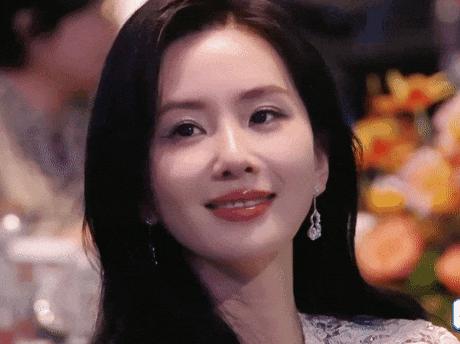 內場上則換了身黑色簡約長裙,鏡頭掃到她時,都是儀態端正地坐着,時而露出招牌式的抿嘴微笑。