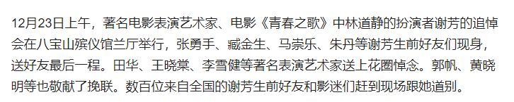 12月23日,謝芳的遺體告別儀式在八寶山殯儀館蘭廳舉行,謝芳的親朋好友和衆多影迷紛紛來到現場送謝芳最後一程。