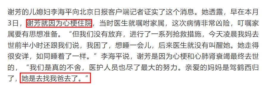 接受媒體採訪時,謝芳的兒媳李海平難過地說:“我們是真的不捨,醫護人員也盡了最大的努力。親愛的媽媽是駕鶴西歸了,她是去找我爸去了。”