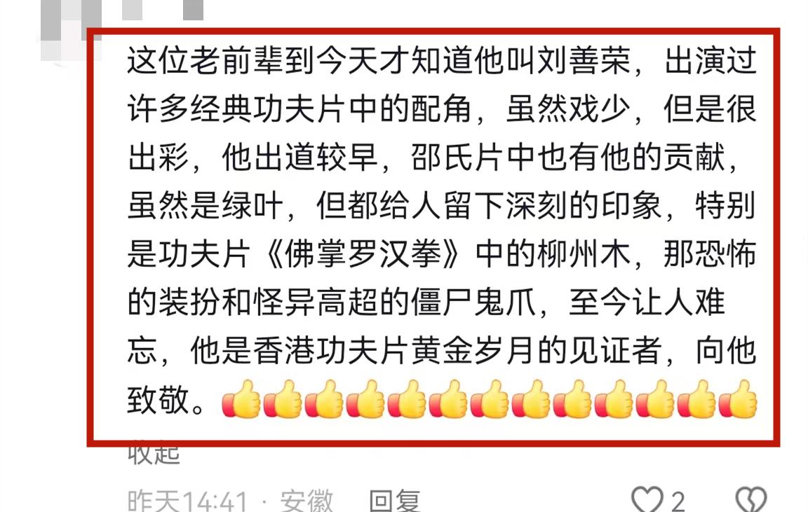 有網友說他看了很多劉善榮的電影,直言他作爲配角,雖然戲份很少,但是很出彩,給人留下了深刻印象。該網友還特意舉例劉善榮在《佛掌羅漢拳》中的表現至今讓他難忘。他還說劉善榮是香港功夫片黃金歲月的見證者,向他致敬。