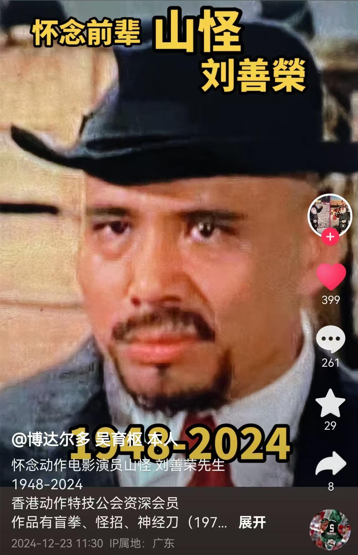 吳育樞在12月23日11點30分發文稱“懷念動作電影演員山怪劉善榮先生”,吳育樞列舉了劉善榮的代表作品,並曬出了他的大量劇照悼念他。