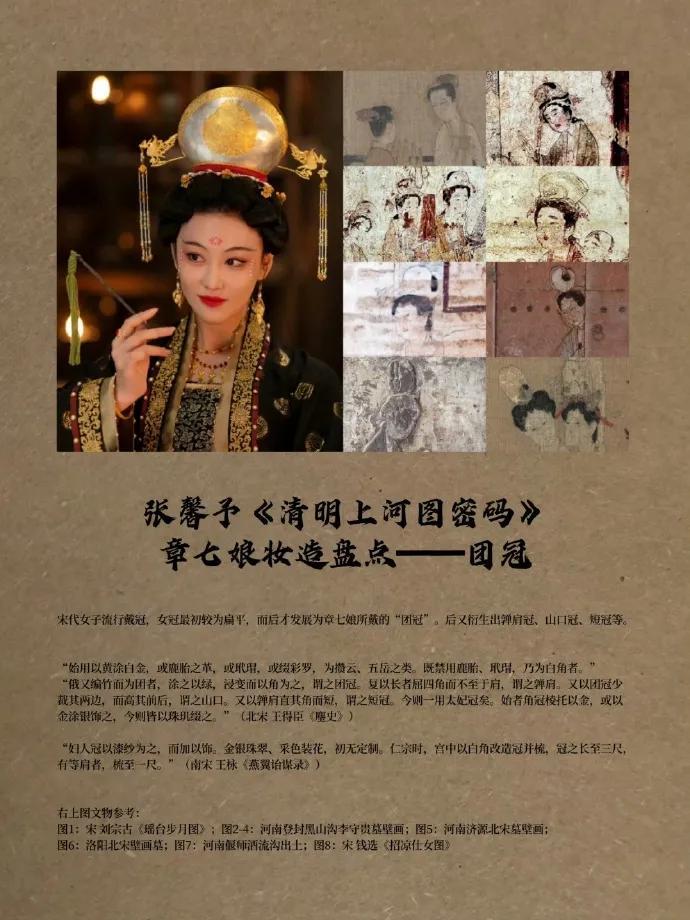 其實張馨予在劇中的造型,就是從“白沙宋墓”的壁畫中摳下來的,頭上頂的那團冠,就是當時有身份地位的女性的日常造型。