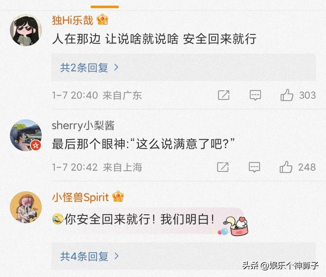 心真大,還回來,咋想的呀!估計不這麼說,也不行吧,人在屋檐下下,不得不低頭,不愧是演員,給臺詞就能演,希望回家以後可以說真話,最後那個眼神,貌似在說這回你們滿意了吧。