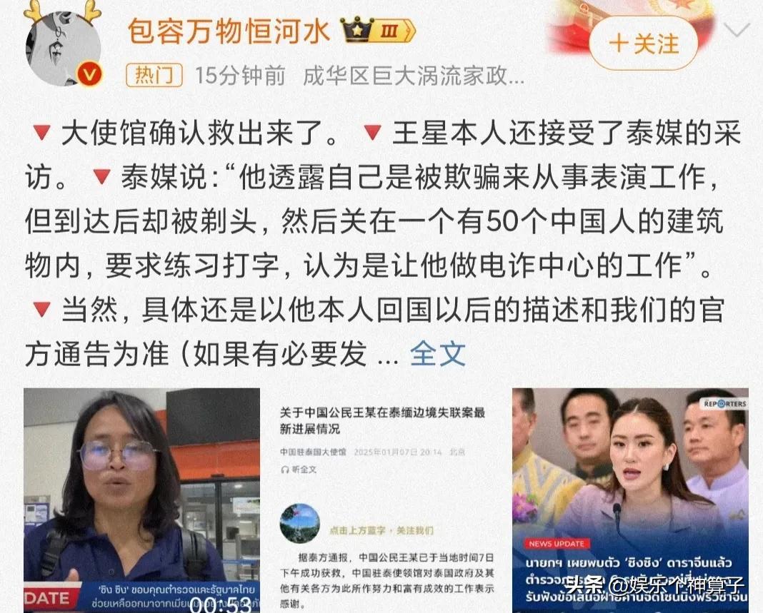 1月7日,傳來好消息,據媒體報道,在緬甸邊境失聯好幾天,演員王星成功獲救,此外,網上爆料,目前已經回到泰國了,這下,家人可以安心了。