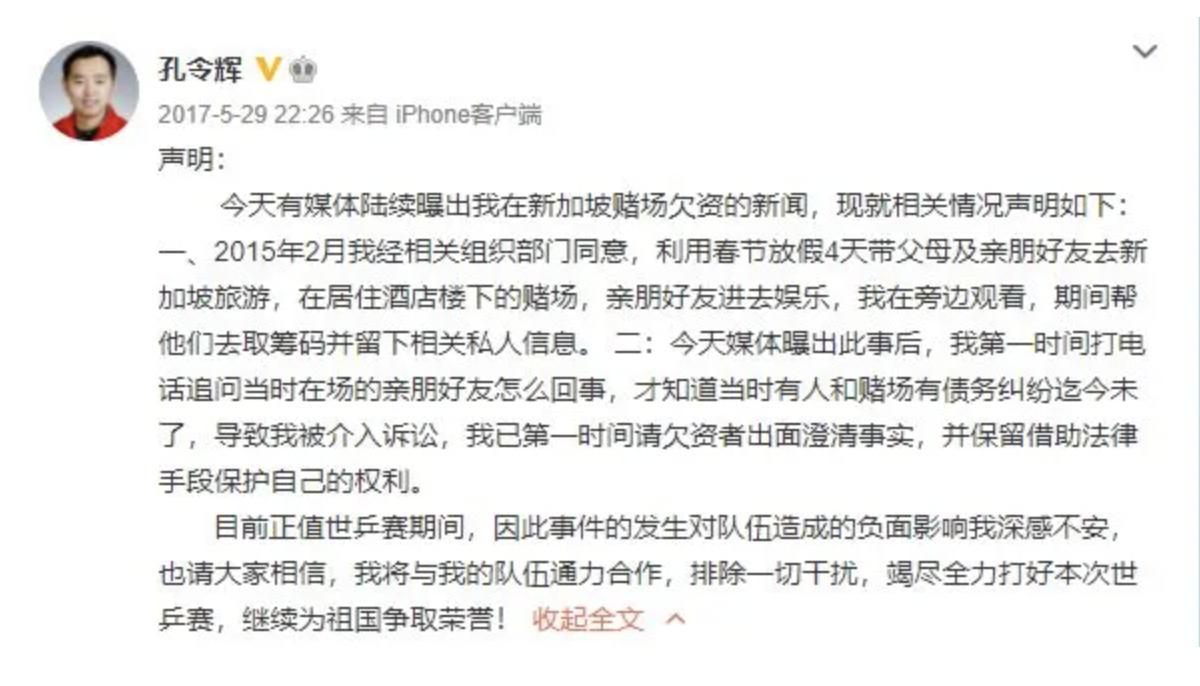 因爲事情影響力比較大,孔令輝在10個小時後便發文回應了賭博欠資一事。