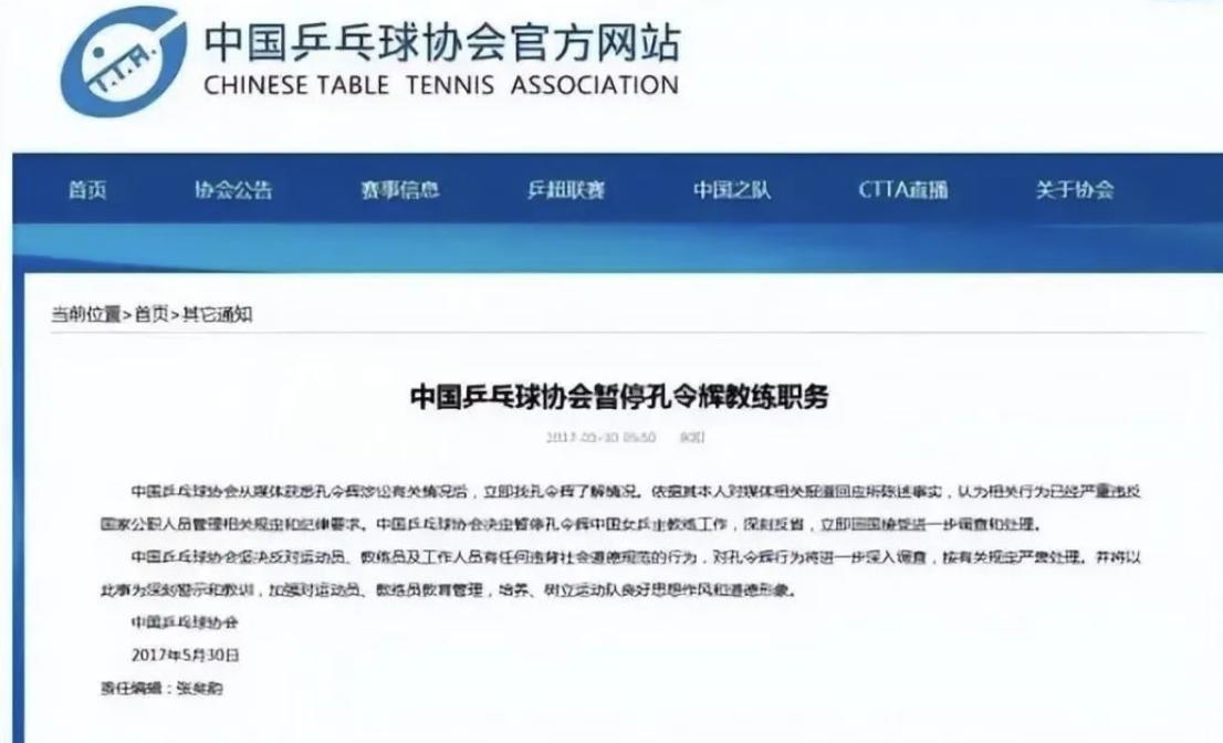 2017年,中國乒乓球協會發布了一則通告,暫停孔令輝的教練職務,並讓其立即回國接受調查。