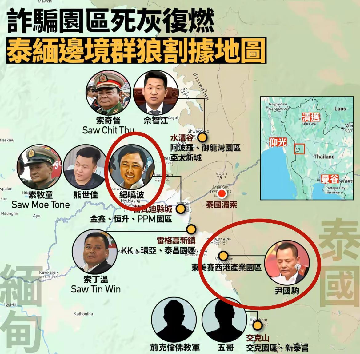 港臺媒體還製作了一份緬東的詐騙園區勢力範圍圖,可以看到崩牙駒的東美集團賽西港園區赫然在列。