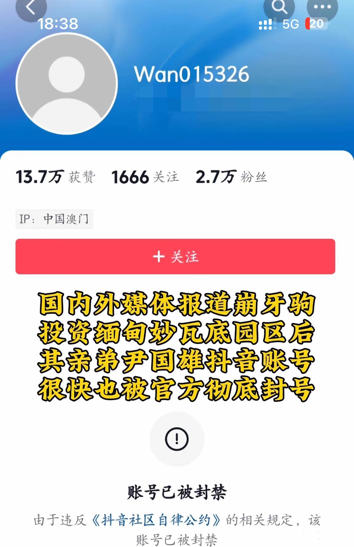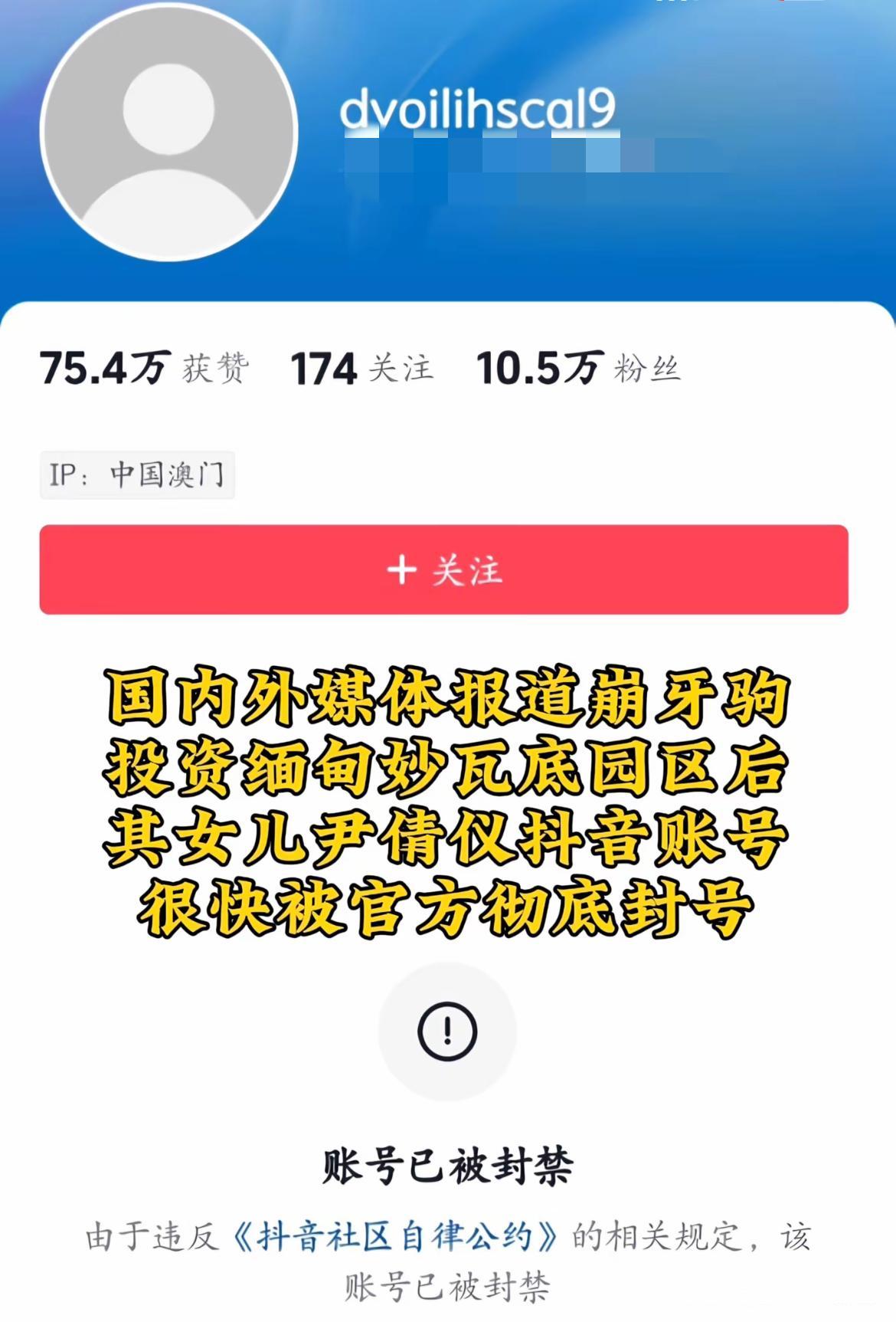 值得一提的是,在海外媒體報道崩牙駒涉嫌電詐之後,他弟弟和女兒的賬號以及忠義洪門文化賬號已經被封禁。