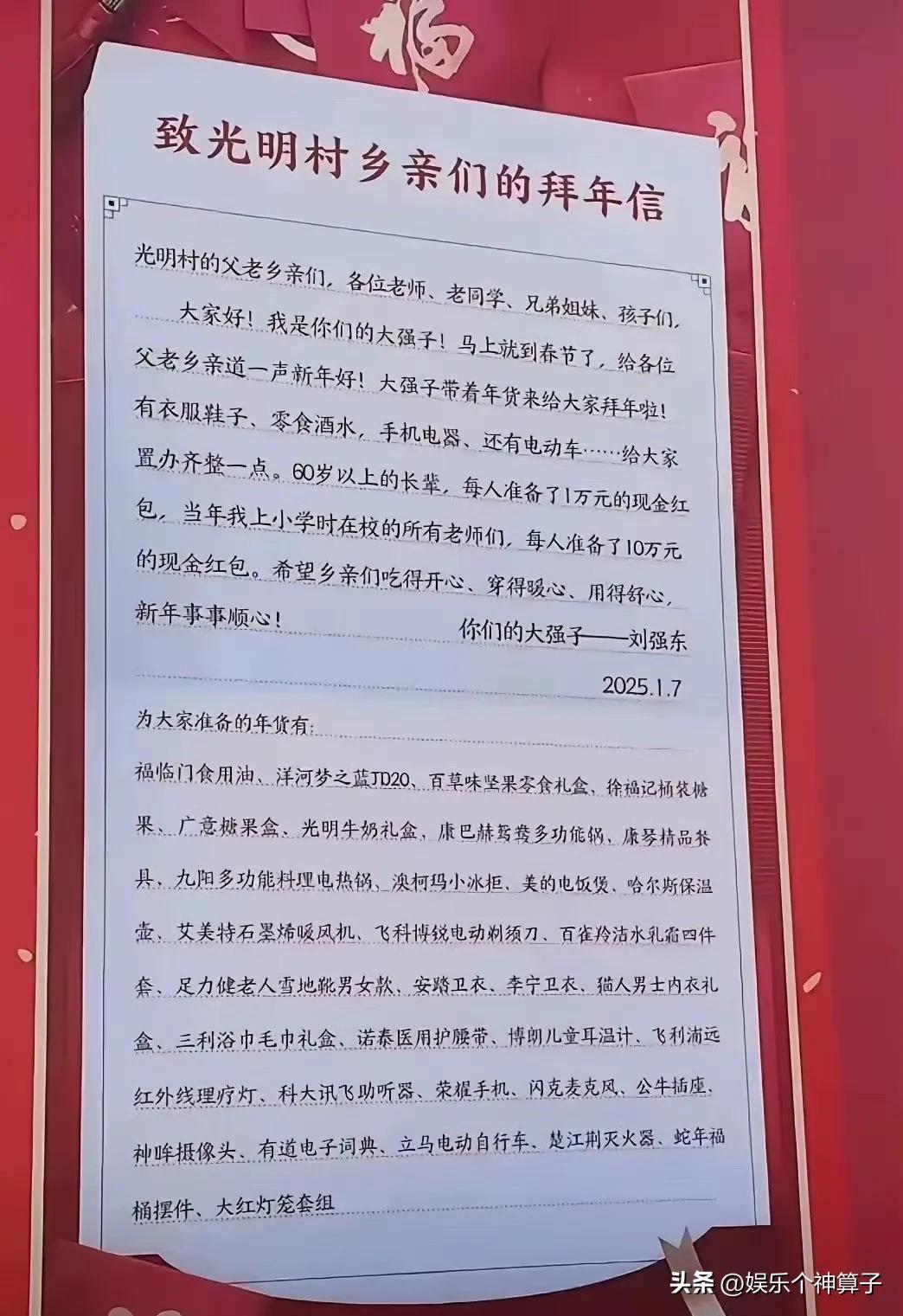 劉強東回宿遷光明村,還特意寫了一封拜年信,咱們先看看這稱呼,直接把村民當成了親人,自己則成了“大強子”,這一刻,沒有什麼劉總,只有樸實的農民,沒有忘本。