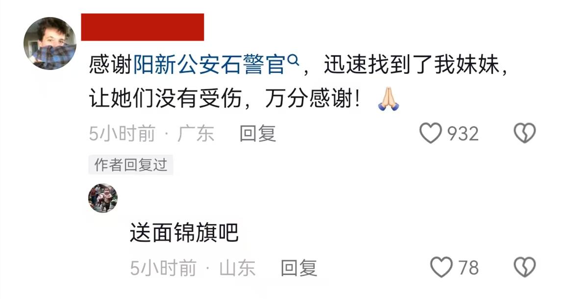在評論區,許好寧的哥哥留言感謝了湖北陽新公安迅速找到了他妹妹,讓她們沒有受傷。