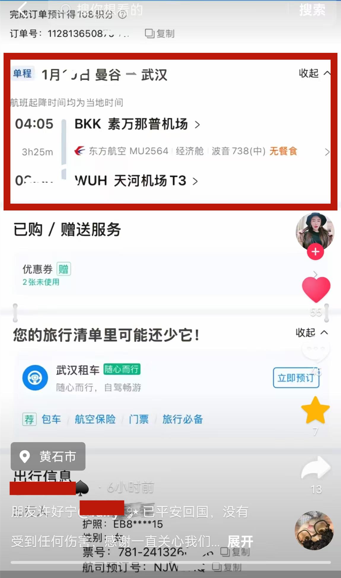 其中許好寧的一位好友還曬出了許好寧回國的機票信息。可以看到許好寧是1月10日4點05分從泰國素萬那普機場出發,在武漢天河機場落地。