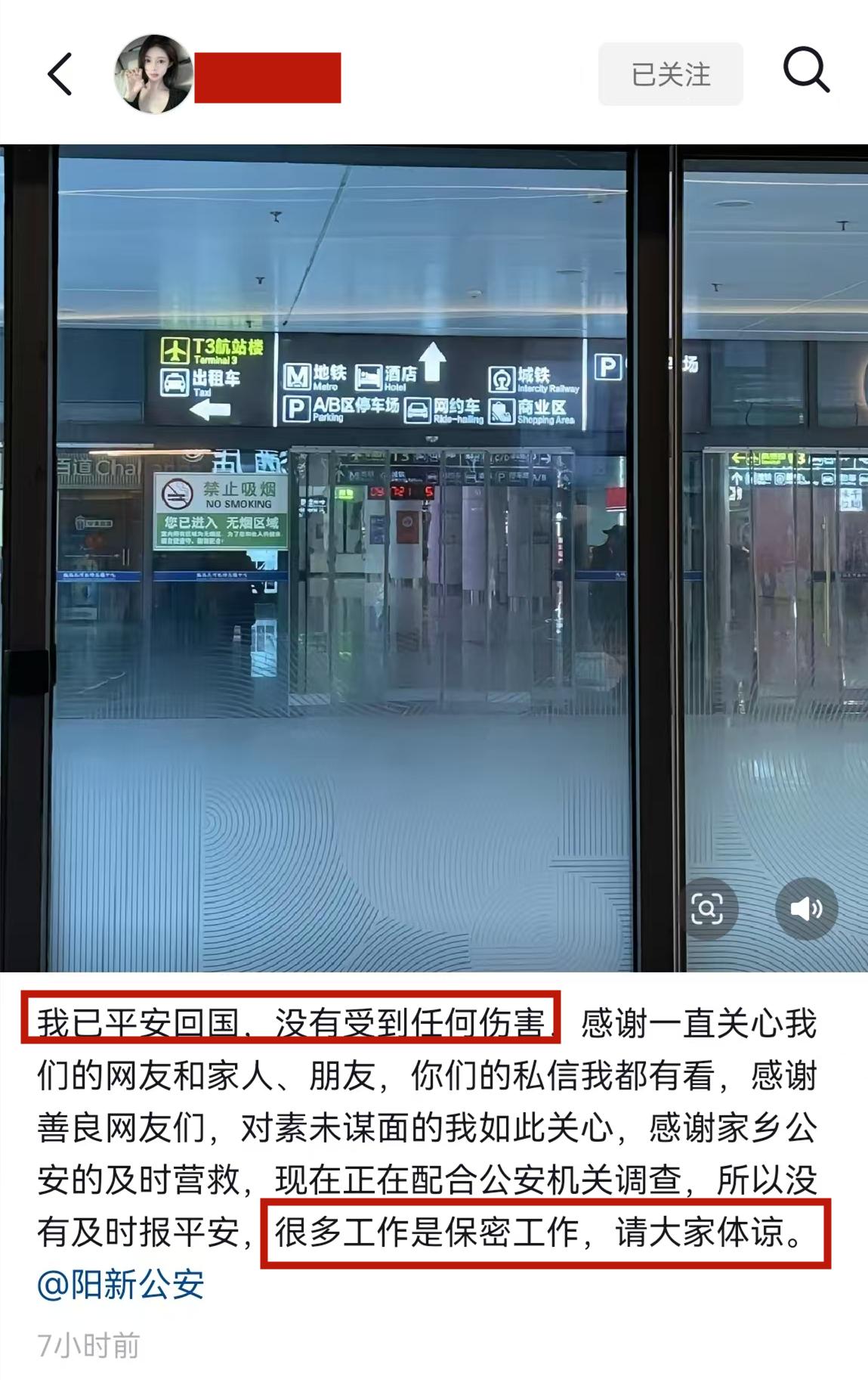 她說她已經安全回到國內,感謝各方的幫助和關心,她還說她在園區沒有受到任何傷害,至於爲什麼現在才發聲報平安,是因爲很多工作目前需要保密,希望大家體諒。
