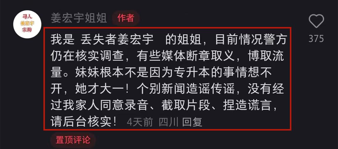 面對此說法,姜宏宇的姐姐特意發文闢謠,她說她的妹妹不是因爲專升本而失蹤,是有些媒體斷章取義發佈不實信息。