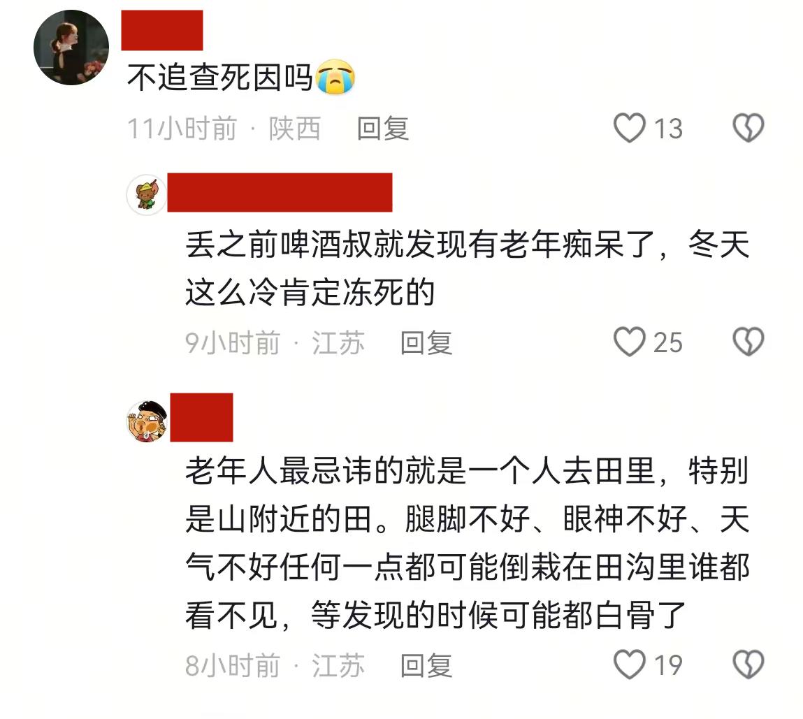 大部分網友猜測啤酒叔可能是趕集回來時,摔到田裏了,加上年紀大了,氣溫又低,最終不幸去世。