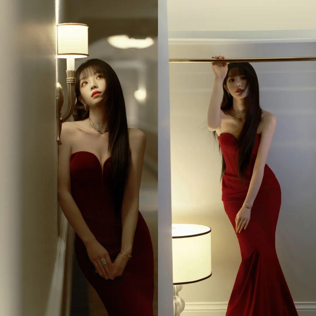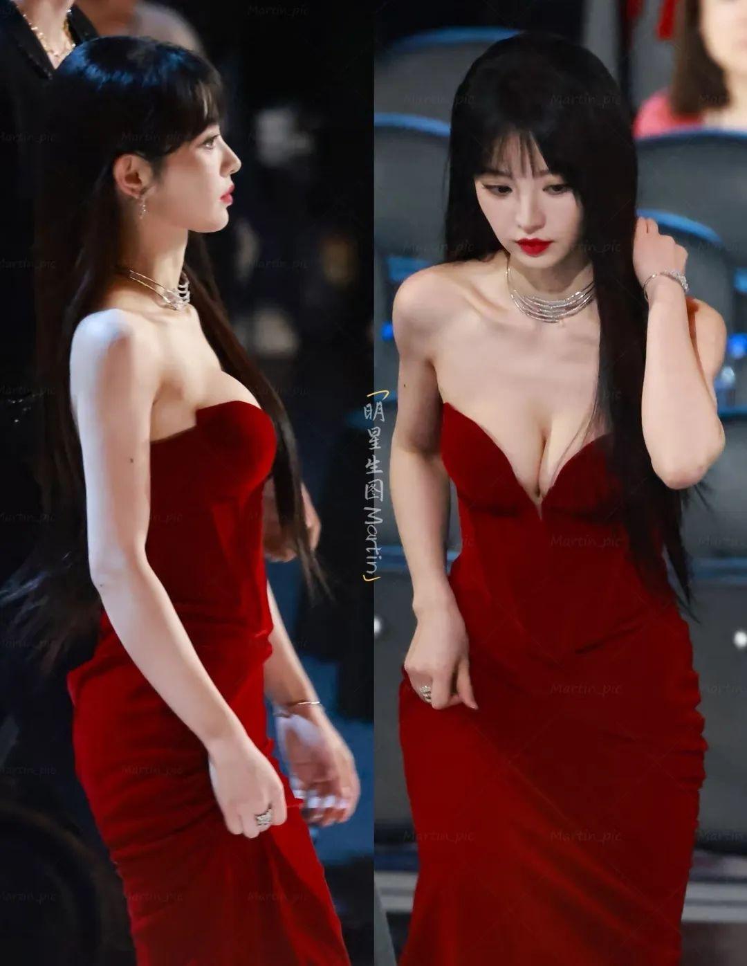 這件紅色低胸魚尾長裙的緊身設計,大膽地展示了她絕美的腰臀曲線,酥胸半露,腰細臀翹。