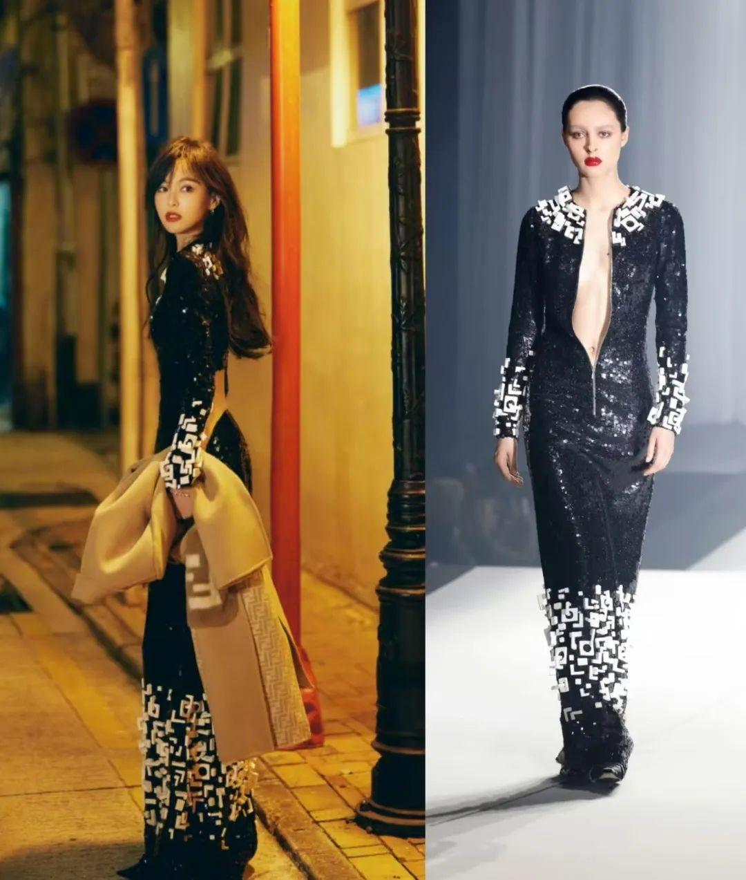 另外一套造型出自FENDI 2023秋冬系列,前開叉的黑色亮片禮服,搭配紅脣與微卷披肩長髮,優雅性感。