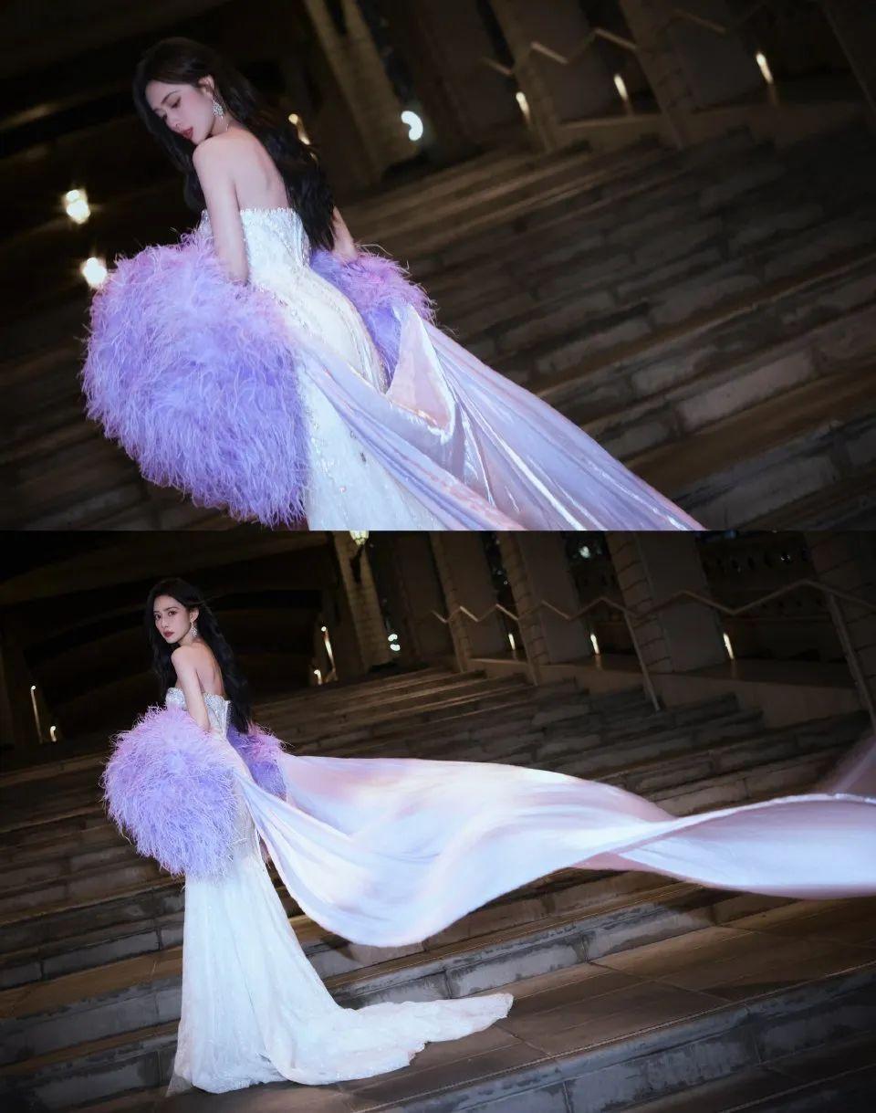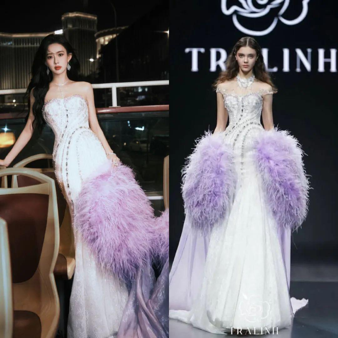 孟子義的紅毯造型是刺繡抹胸長裙+紫色羽毛長拖尾,禮服來自TRALINH 2025 秋冬系列。