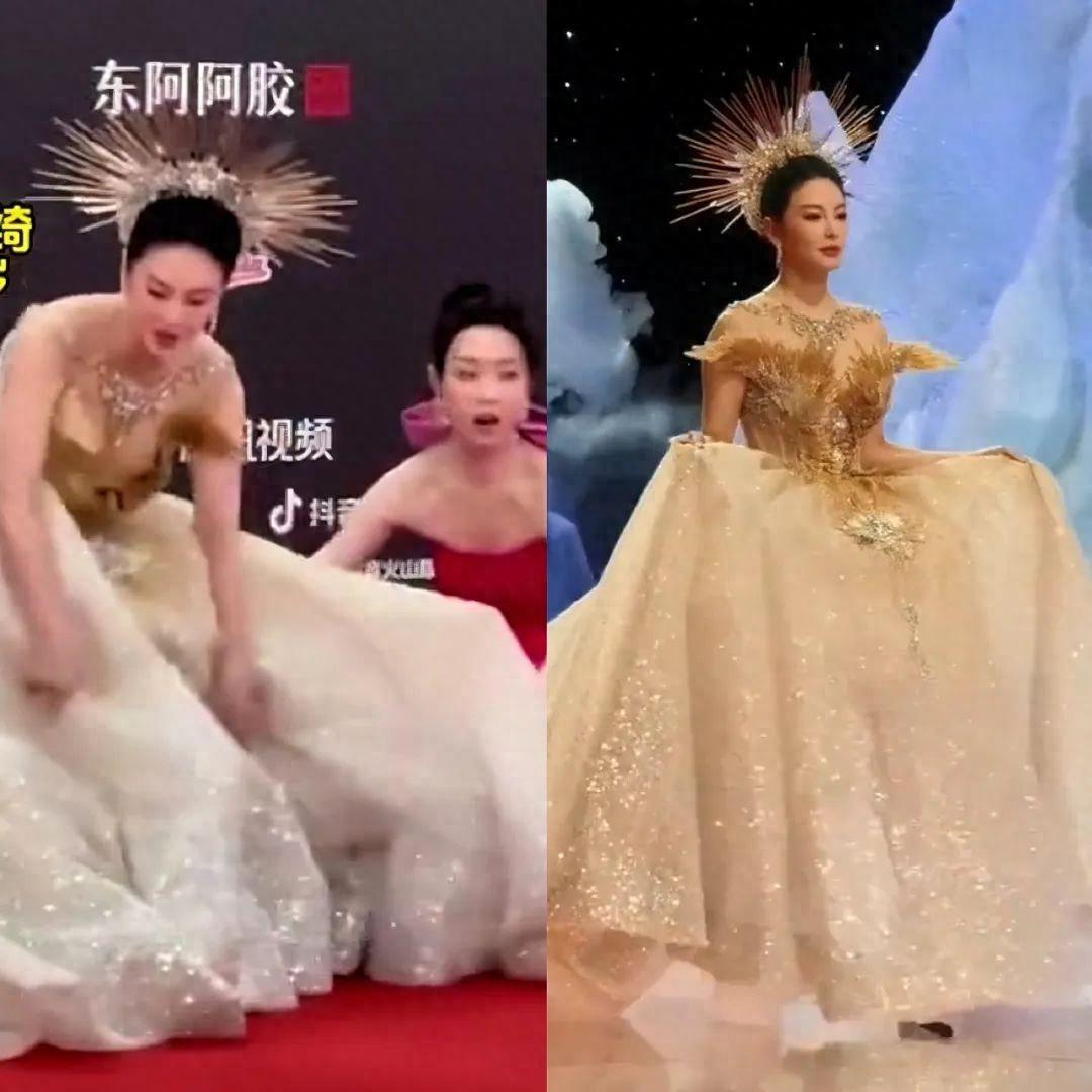紅毯上都得提着裙子才能走,走得那叫一個艱難,一不小心都有可能跌倒。