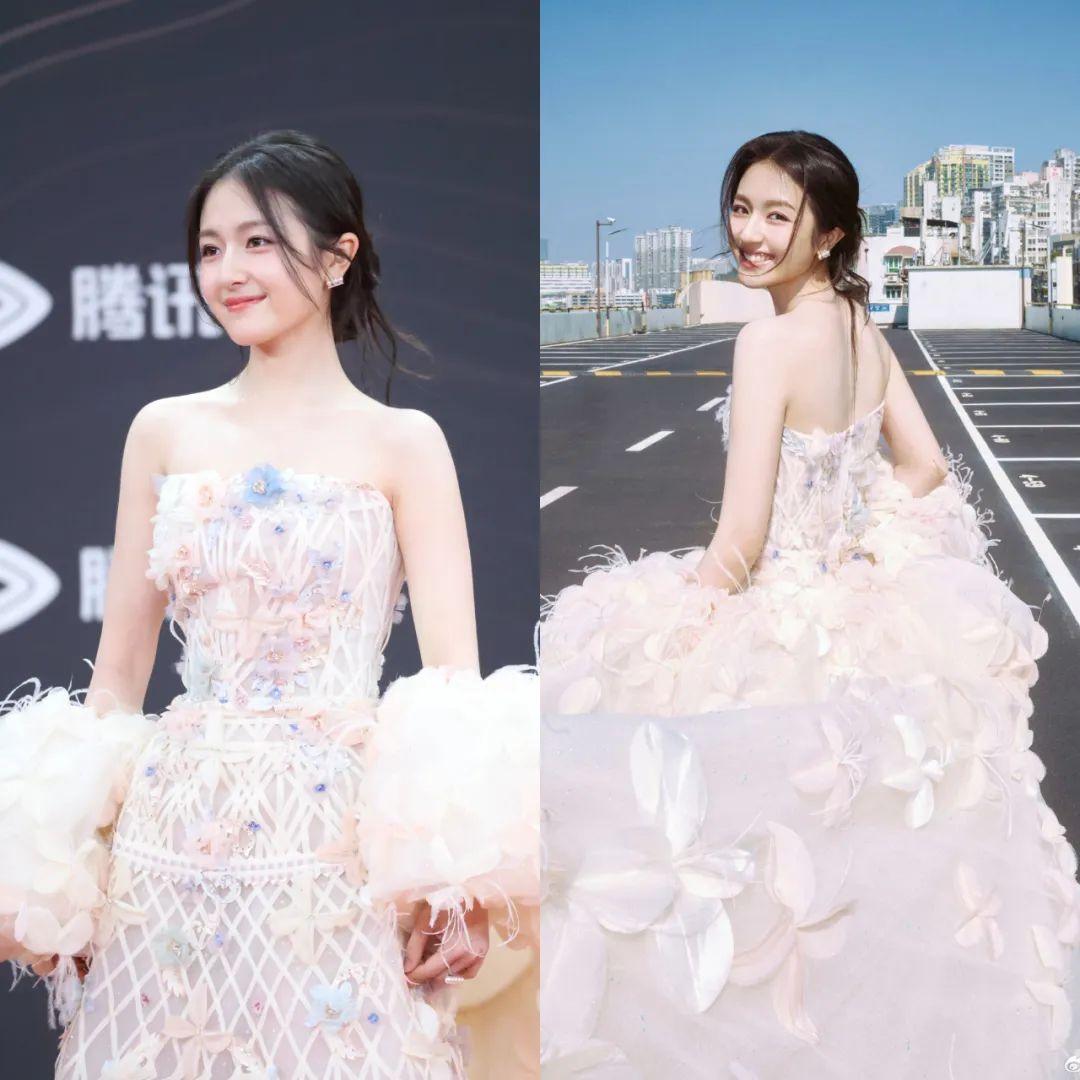 粉嫩的立體繁花裙與她的年齡也很搭,加上有“氣血感”的妝容,讓人一眼心動的明媚旖旎,一整個“人間花仙子”。