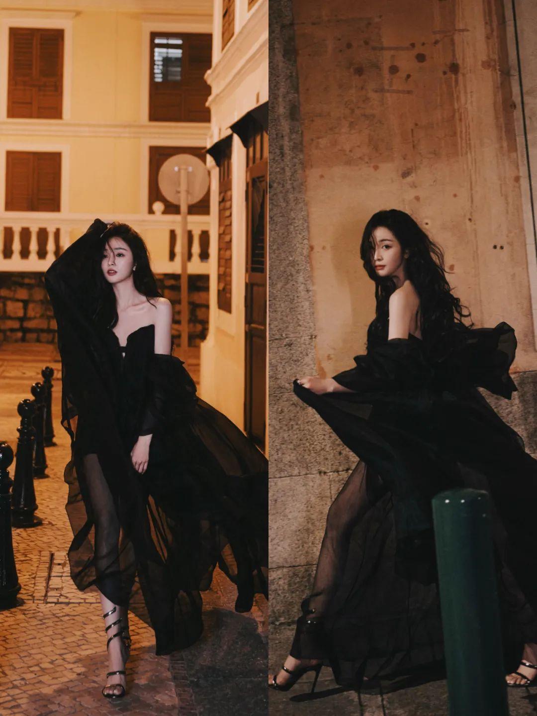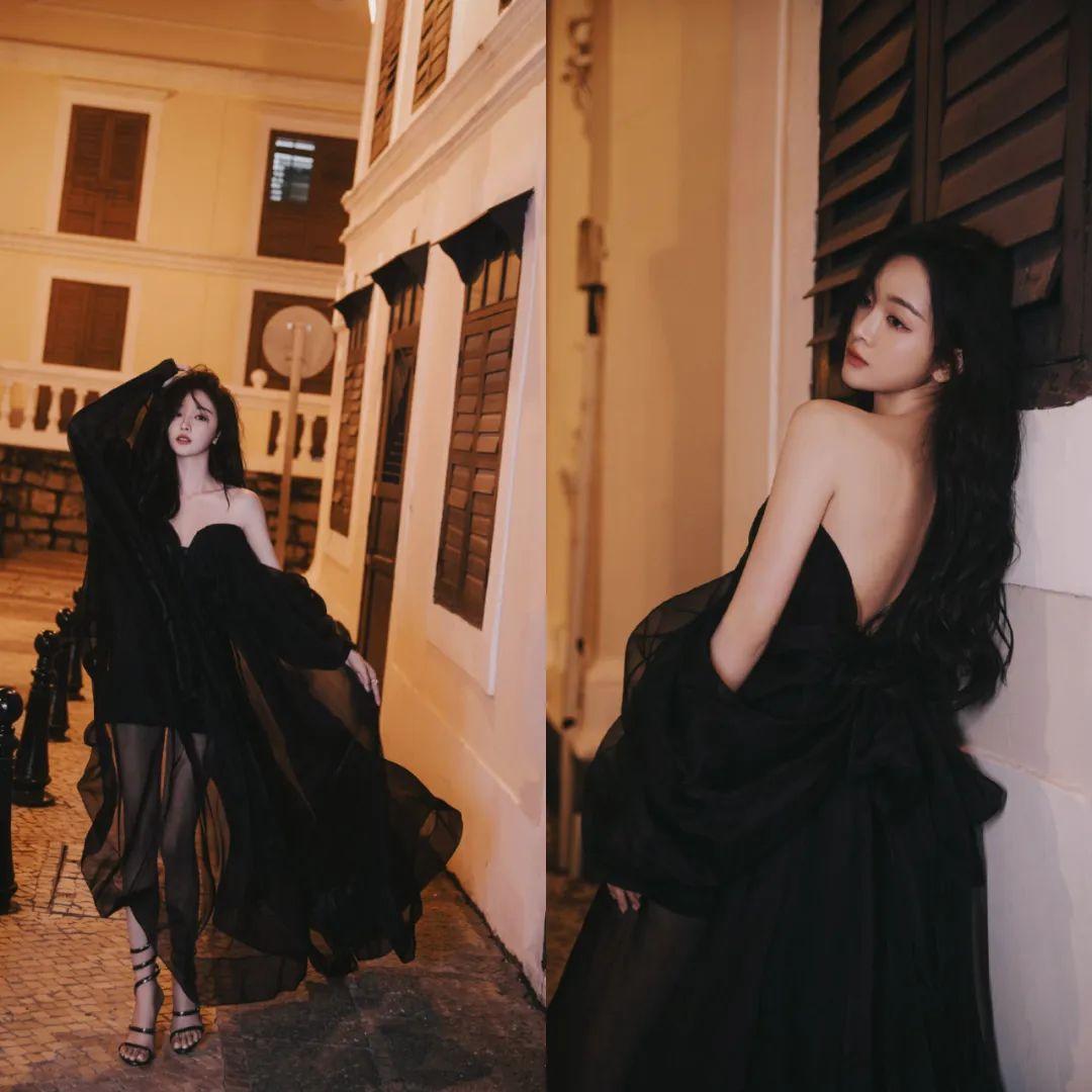 相較之下,她本人分享的這套黑色深V薄紗裙更撩人,沒走紅毯可惜了。