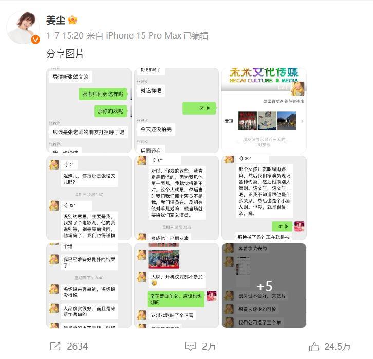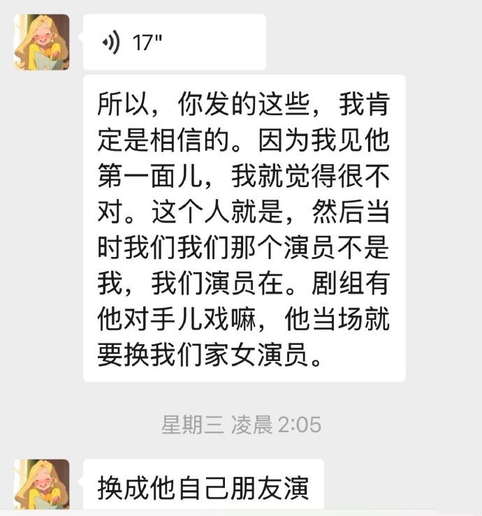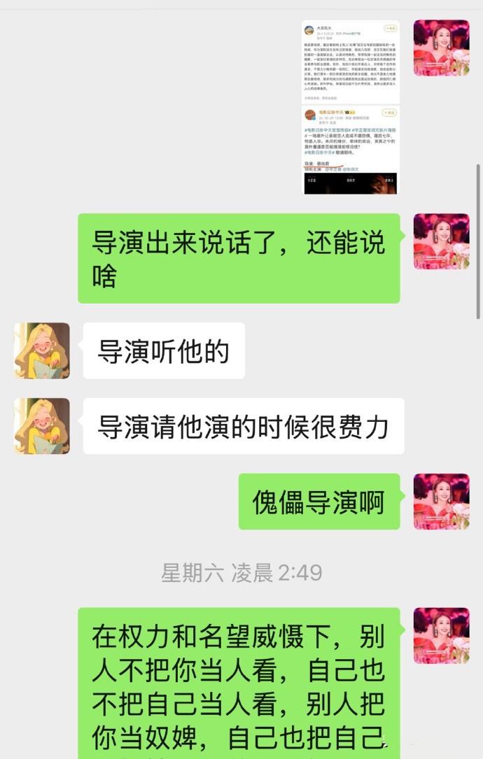 在曬出的聊天記錄中,則曝張頌文耍大牌,在劇組強行換女演員,使導演成爲傀儡導演等瓜。