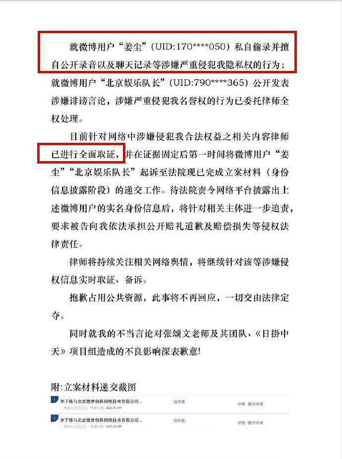 李子鋒沒有被姜塵嚇到,1月9日,她發佈了一份聲明,直言姜塵侵犯了她的隱私權,她已經讓律師全面取證,將起訴她。