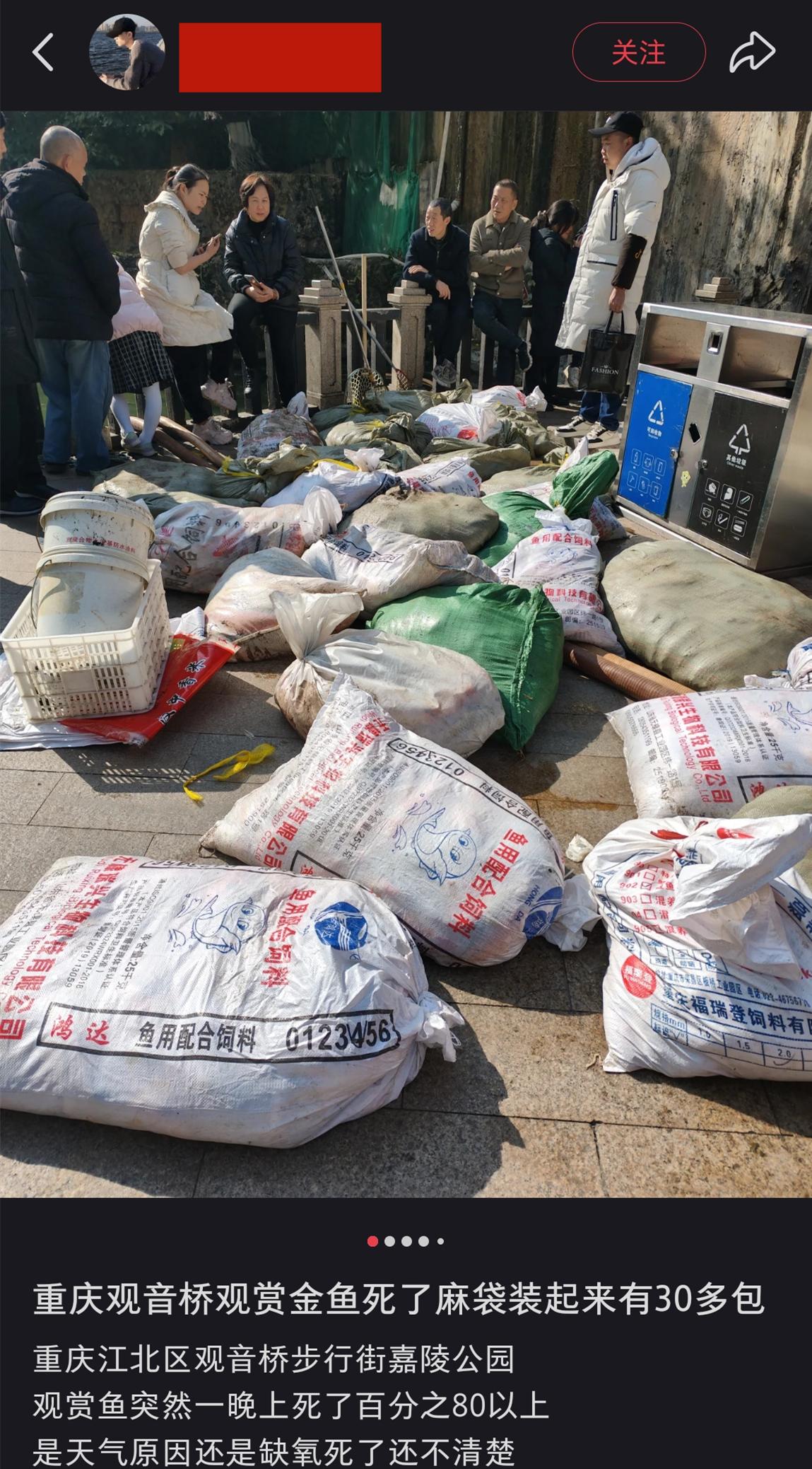 綜合這些帖子的信息可知,事發地點是重慶江北區觀音橋步行街的嘉陵公園,發現大量錦鯉死亡的時間是1月12日清早。