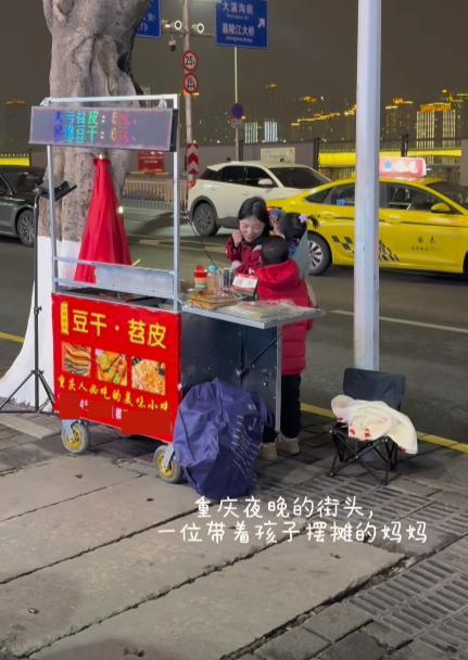 從視頻中可以看到,在重慶的夜晚,林靜帶着2個孩子擺攤賣豆乾、苕皮。
