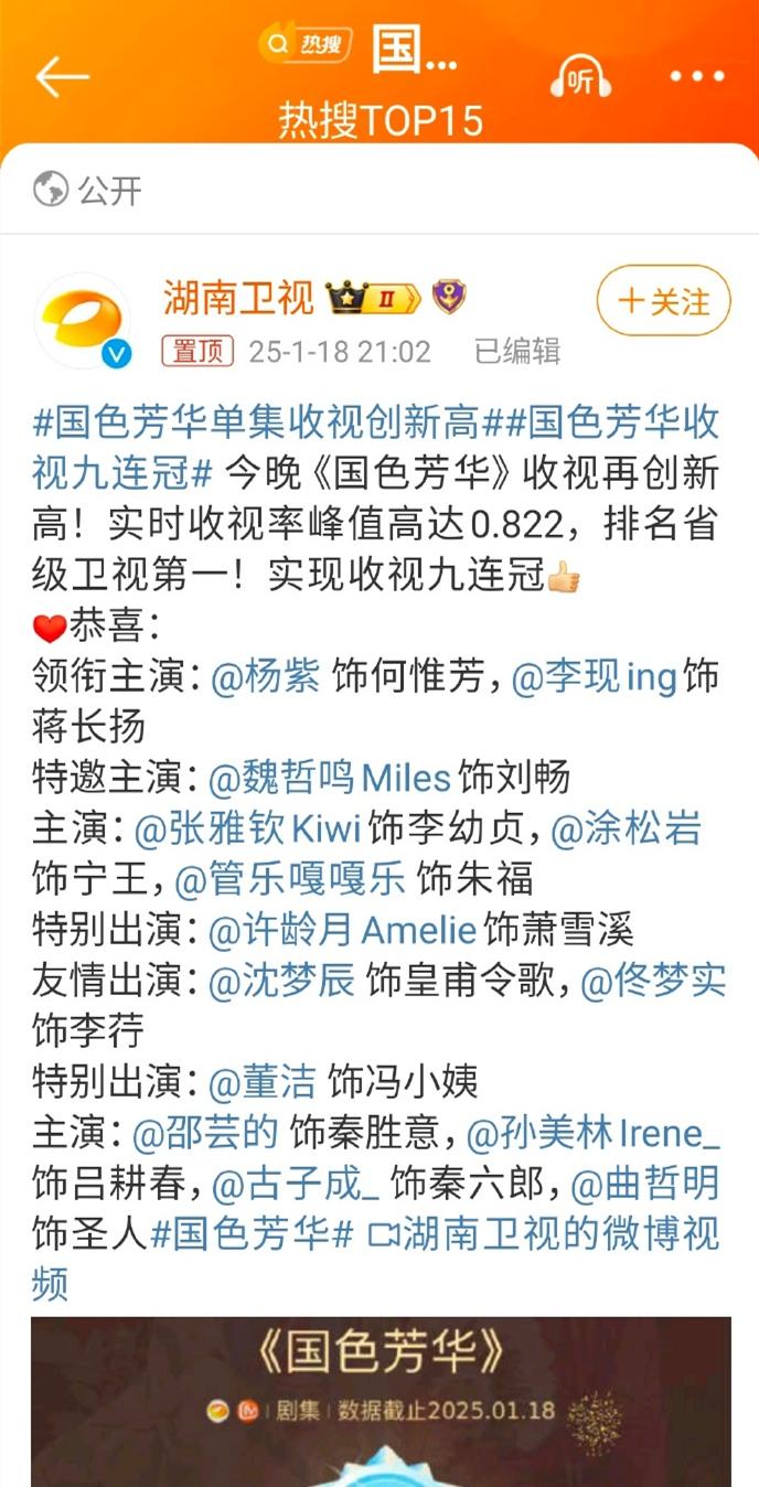 目前,《國色芳華》正在湖南衛視和芒果TV雙平臺熱播,1月18日實時收視率峯值高達0.822,排名省級衛視第一,實現收視九連冠。並且雲合市佔率達到驚人的19.1%。