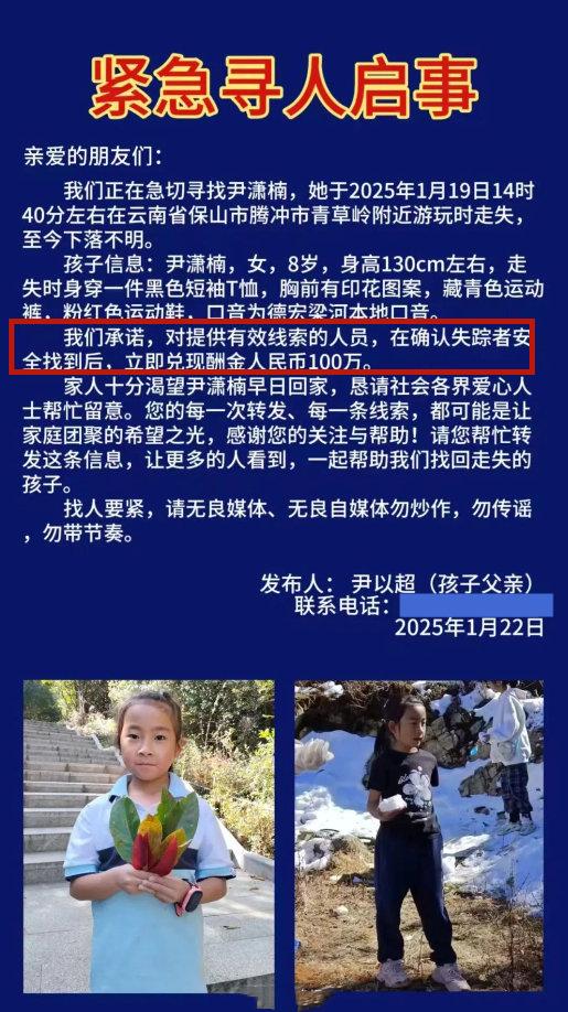爲了儘快找到女兒,尹先生在尋人啓事中直接寫出如果有人能提供尹瀟楠的有效線索,將給予100萬酬金。