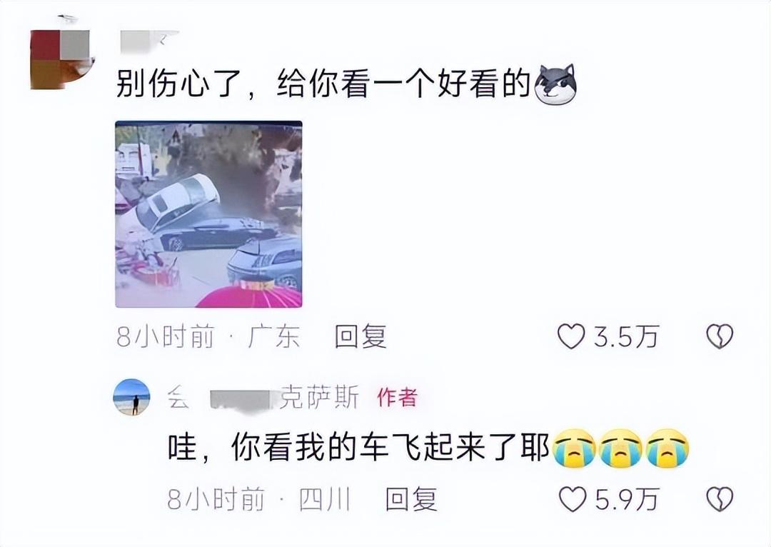 有網友在評論區發佈他的車子被炸飛的動圖,並留言:別傷心了,給你看一個好看的。