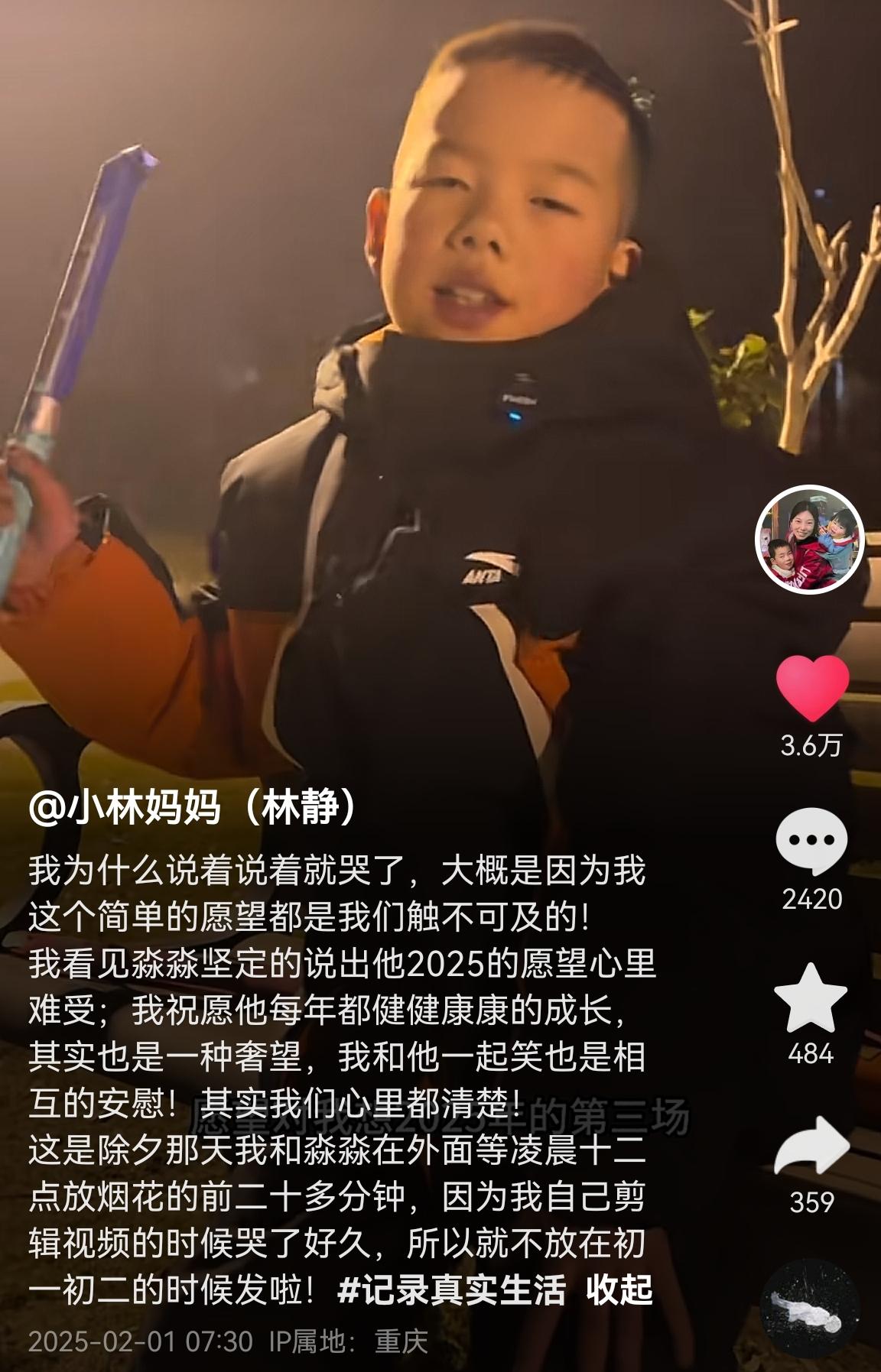 不過這條視頻是在除夕晚上凌晨12點前放煙花之前拍的,因爲拍攝視頻和剪輯視頻時都哭了,爲了不影響大家的心情,所以小林媽媽纔在2月1日發佈了這條視頻。