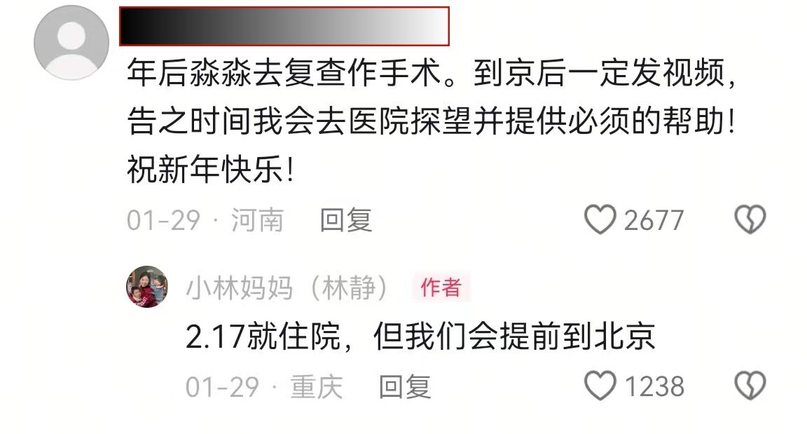 根據小林媽媽在評論區與網友的互動可知,她的兒子將會在2月17日住院,她會帶着孩子提前去北京。