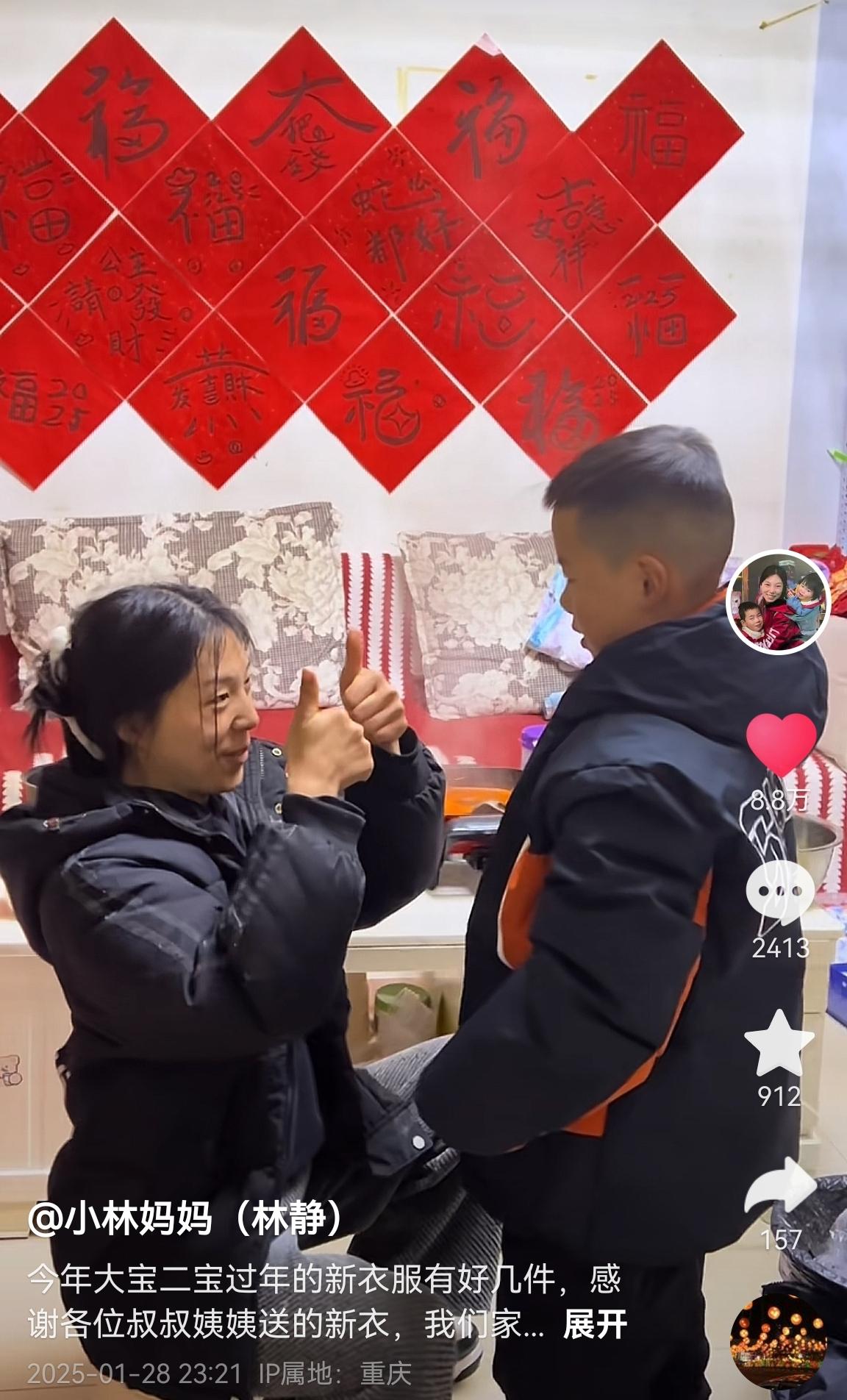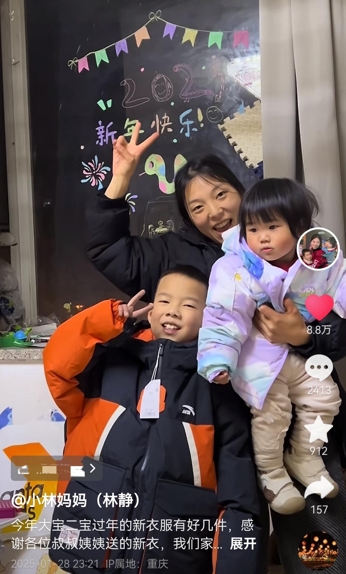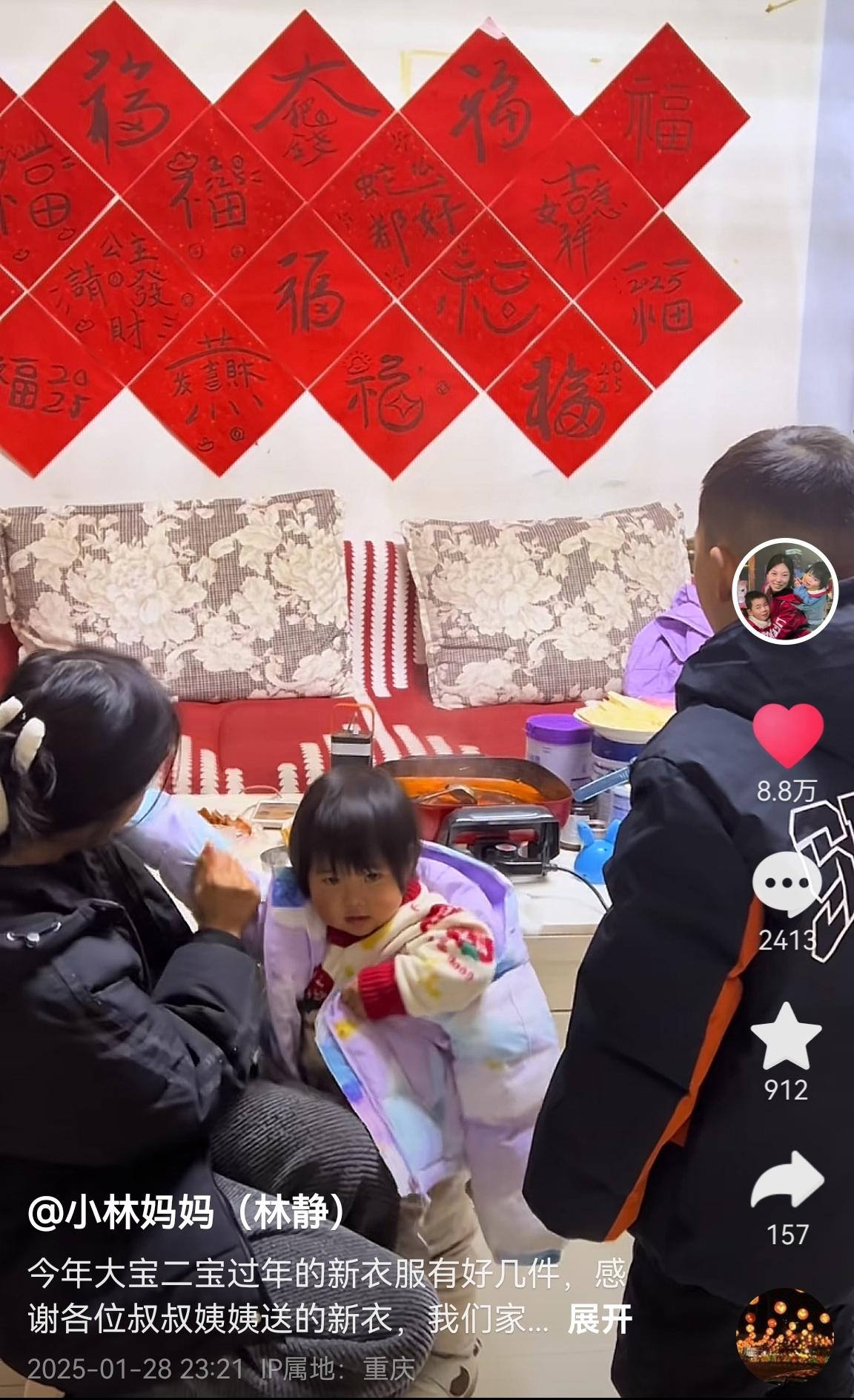 在視頻中,小林媽媽親自給兩個孩子穿上了新衣。