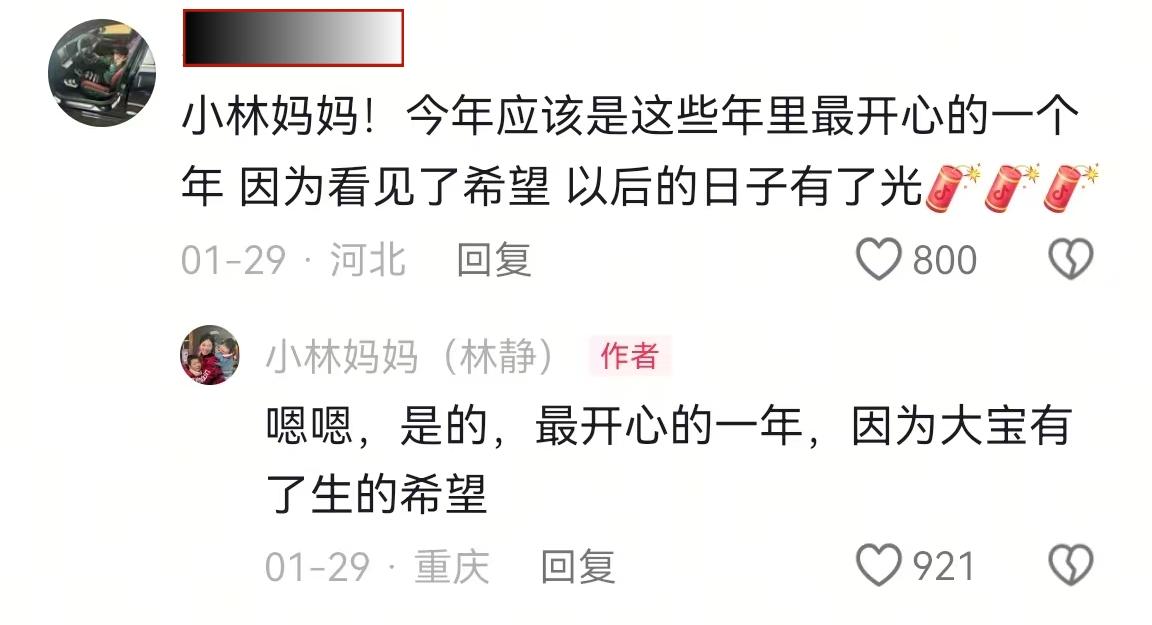 在評論區回覆網友時,小林媽媽也坦言2025年是最開心的一年,“因爲大寶有了生的希望。”