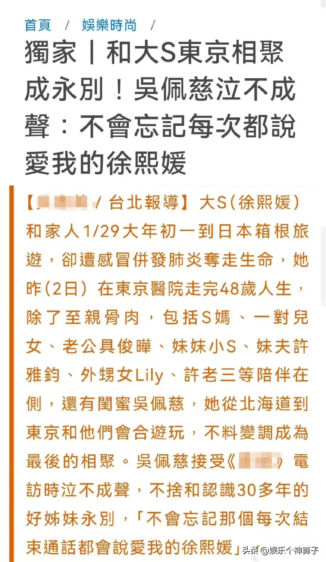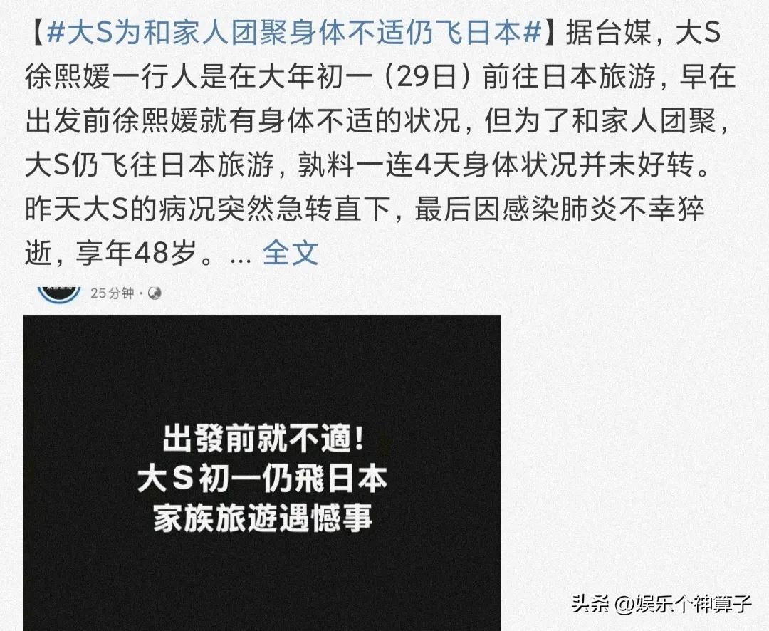 2月3日,家人透露,48歲大S患流感併發肺炎,不幸去世,隨後,網上曝出更多細節。