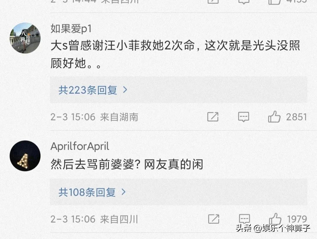 一些網友表示:具俊曄平時就會秀恩愛,經常在節目裏透露很會疼老婆,這一次,大S病情這麼嚴重,就是沒有照顧好,家人也不是很上心,但凡當回事,悲劇也不可能發生。
