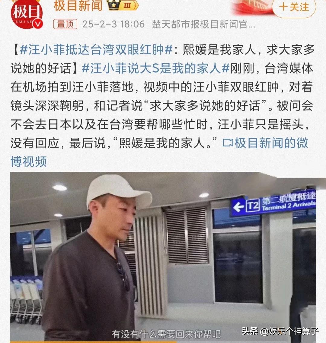 目前,汪小菲已經抵達臺灣,面容憔悴,雙眼紅腫,接受採訪時,深深鞠躬,希望媒體多說大S的喊話,坦言徐熙媛是我的家人。