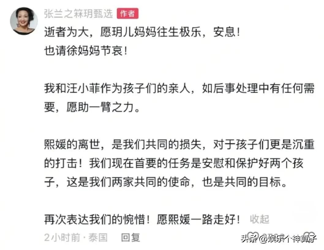 2月3日,媒體報道大S去世,網友深感惋惜,衆多明星紛紛發文悼念,就連張蘭也在社交平臺發文,透露悲傷與不捨。