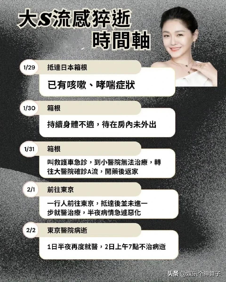 48歲大S春節猝逝,消息一出,網友在悲痛和惋惜之餘,仍充滿疑惑,就算有基礎病,患流感也不至於,輕易被奪走生命,隨着網上越來越多的爆料,更多細節流出。