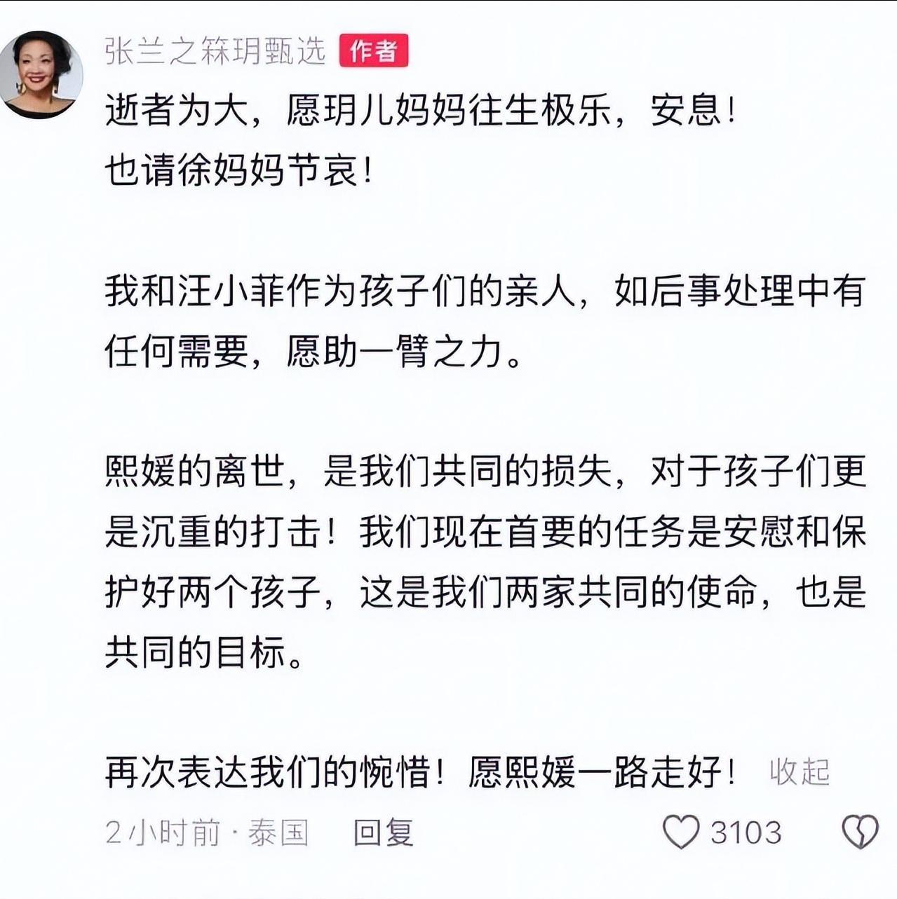 她寫道大S的離世,是兩家共同的損失,對孩子們的打擊非常沉重。他們現在的首要任務就是安慰和保護好2個孩子。