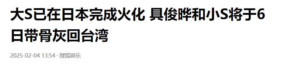 如今,隨着大S的火化完成,大S的老公具俊曄和妹妹小S將帶着大S的骨灰在2月6日返臺。