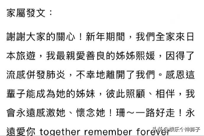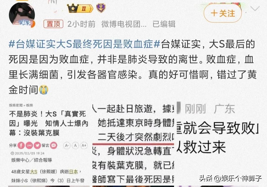 這裏有一點疑惑,小S發文時透露,因得了流感併發肺炎不幸離世,並未提到敗血症,按理說,家人的消息比較真實,到底該相信哪種說法,讓人一頭霧水。
