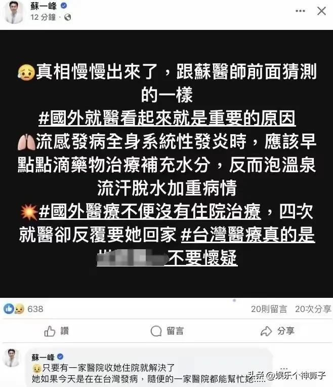 此外,看到胸科醫生蘇一峯談大S死因,提到四次住院被拒絕,感冒期間還去泡溫泉,使得病情加重,話說,網上的各種說法,有些真假難辨。