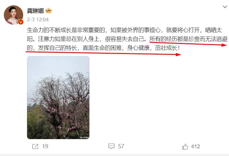 也是在2月3日的中午,龔琳娜發文“所有的經歷都是珍貴而無法逃避的,發揮自己的特長,直面生命的困難,身心健康,茁壯成長!”