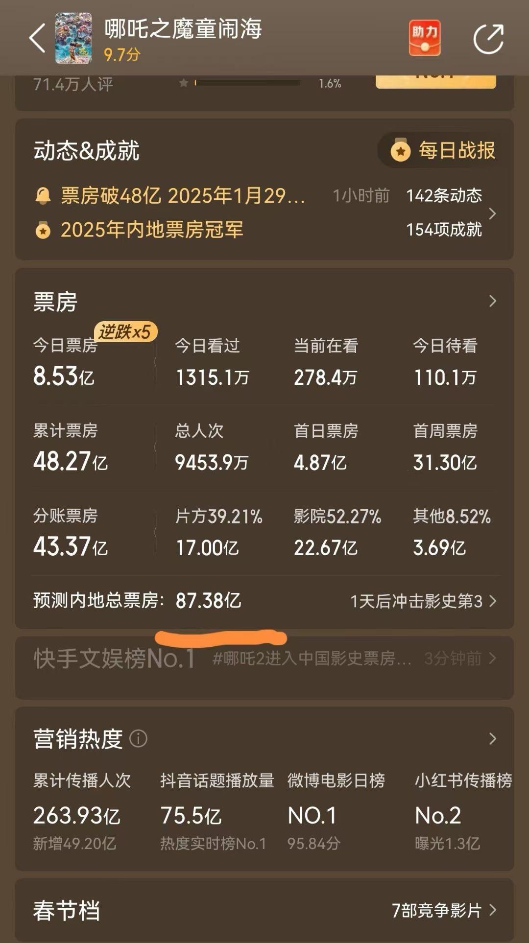 而預估總票房更是來到了驚人的87億,拿下影史冠軍已經沒有懸念了。